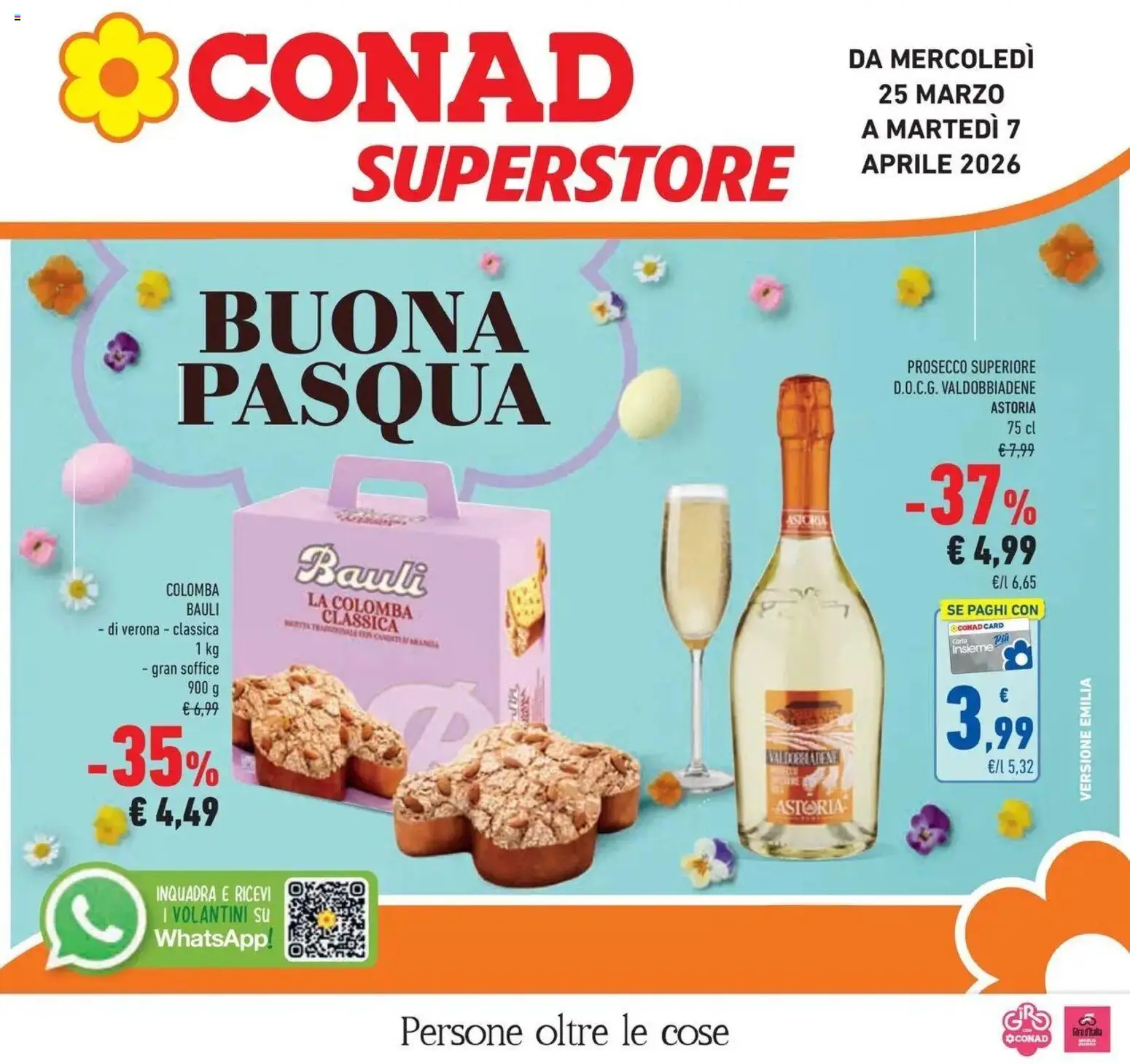 {"147751":[{"boxes":[{"content":"CONAD","coord":[[127,17],[436,17],[436,85],[127,86]]},{"content":"DA MERCOLED\u00cc","coord":[[579,30],[711,29],[711,48],[579,49]]},{"content":"25 MARZO","coord":[[601,55],[690,55],[690,72],[601,72]]},{"content":"SUPERSTORE","coord":[[239,96],[547,97],[547,140],[239,138]]},{"content":"A MARTED\u00cc 7","coord":[[589,78],[700,78],[700,95],[589,96]]},{"content":"BUONA","coord":[[133,195],[361,195],[361,245],[133,245]]},{"content":"PASQUA","coord":[[119,240],[375,242],[375,309],[119,306]]},{"content":"PROSECCO SUPERIORE","coord":[[621,245],[710,245],[710,256],[621,256]]},{"content":"D.O.C.G. VALDOBBIADENE","coord":[[611,258],[710,259],[710,272],[610,271]]},{"content":"ASTORIA","coord":[[678,274],[710,274],[710,283],[678,284]]},{"content":"75 cl","coord":[[689,288],[710,288],[710,298],[689,297]]},{"content":"ASTORIA","coord":[[539,352],[567,352],[567,361],[539,360]]},{"content":"Bauli","coord":[[203,368],[297,377],[295,412],[200,402]]},{"content":"COLOMBA","coord":[[114,398],[149,398],[149,409],[114,409]]},{"content":"BAULI","coord":[[125,412],[150,412],[150,423],[125,422]]},{"content":"LA COLOMBA","coord":[[211,403],[288,412],[288,427],[210,417]]},{"content":"SE PAGHI CON","coord":[[648,413],[711,413],[712,422],[648,422]]},{"content":"di verona classica","coord":[[68,425],[149,426],[148,437],[68,437]]},{"content":"CLASSICA","coord":[[220,417],[275,423],[273,434],[219,427]]},{"content":"CONAD CARD","coord":[[651,428],[688,426],[688,430],[651,433]]},{"content":"Carta","coord":[[653,437],[663,437],[663,441],[652,442]]},{"content":"Insieme","coord":[[652,442],[682,440],[683,446],[653,448]]},{"content":"gran soffice","coord":[[96,454],[150,453],[150,464],[96,465]]},{"content":"NALDIOSSIATIENE","coord":[[524,512],[577,511],[577,525],[524,526]]},{"content":"ASTORIA","coord":[[531,546],[584,544],[584,557],[531,560]]},{"content":"VERSIONE EMILIA","coord":[[740,550],[739,463],[749,462],[749,550]]},{"content":"INQUADRA E RICEVI","coord":[[105,604],[187,605],[187,619],[105,618]]},{"content":"I VOLANTINI SU","coord":[[108,618],[186,618],[186,633],[108,633]]},{"content":"WhatsApp.","coord":[[104,635],[186,638],[186,652],[104,649]]},{"content":"Persone oltre le cose","coord":[[271,693],[502,693],[502,721],[271,721]]},{"content":"CONAD","coord":[[688,708],[719,707],[719,715],[688,715]]},{"content":"Giro d'italia","coord":[[734,704],[756,704],[756,710],[734,710]]}]}]}Le offerte sono valide dal 25/03/2026 - 07/04/2026, ma attenzione: gli sconti sono disponibili solo per un periodo limitato! Sfoglia subito il volantino e scopri prezzi straordinari su frutta e verdura, carne e pesce, latticini e prodotti da forno. Ogni settimana, Conad ti garantisce la massima qualità a prezzi imbattibili.