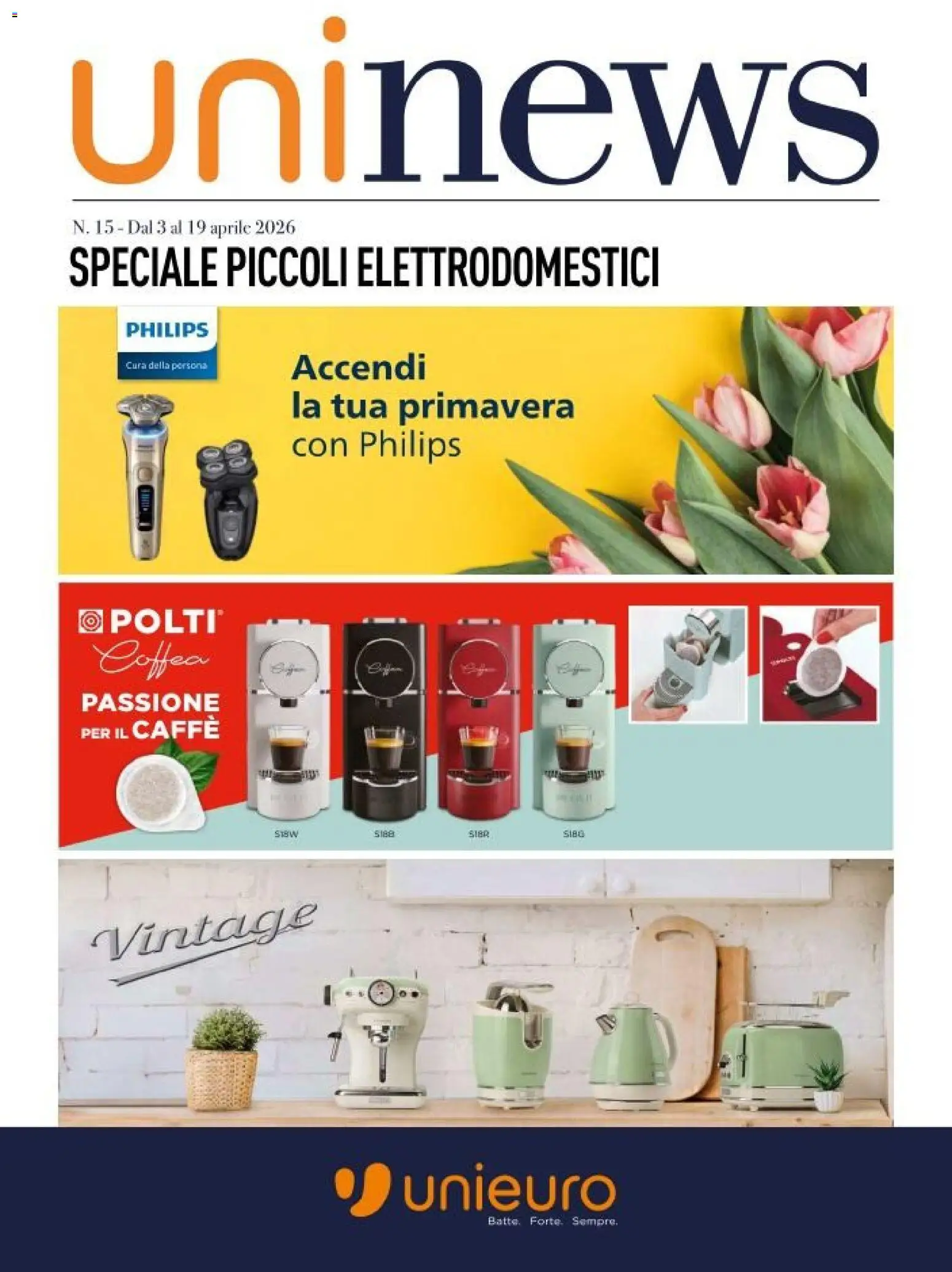 {"148942":[{"boxes":[{"content":"uninews","coord":[[53,20],[715,23],[714,158],[52,158]]},{"content":"SPECIALE PICCOLI ELETTRODOMESTICI","coord":[[52,197],[538,197],[538,236],[52,237]]},{"content":"PHILIPS","coord":[[100,260],[170,259],[170,275],[100,276]]},{"content":"Cura della persona","coord":[[100,293],[170,293],[170,302],[100,301]]},{"content":"Accendi","coord":[[235,284],[351,284],[351,311],[235,311]]},{"content":"la tua primavera","coord":[[235,314],[469,317],[468,347],[234,345]]},{"content":"con Philips","coord":[[237,346],[377,347],[376,380],[237,379]]},{"content":"O POLTI","coord":[[64,494],[178,494],[177,518],[64,516]]},{"content":"Coffee","coord":[[80,519],[176,518],[177,552],[80,553]]},{"content":"PASSIONE","coord":[[64,560],[179,560],[179,582],[64,582]]},{"content":"PER IL CAFF\u00c8","coord":[[63,587],[180,582],[181,603],[63,605]]},{"content":"SIBR","coord":[[380,674],[400,674],[400,682],[381,682]]},{"content":"Vintage","coord":[[72,752],[259,730],[262,762],[75,783]]},{"content":"unieuro","coord":[[327,945],[501,945],[501,989],[327,989]]},{"content":"Batte. Forte. Sempre.","coord":[[396,987],[503,987],[503,1000],[396,1000]]}]}]}Le promozioni sono valide dal 03/04/2026 - 19/04/2026, ma fai attenzione: gli sconti sono limitati nel tempo e i prodotti più richiesti potrebbero terminare presto. Non perdere l’occasione di scoprire cosa Unieuro ha preparato per te questa settimana: prezzi imbattibili e qualità garantita!